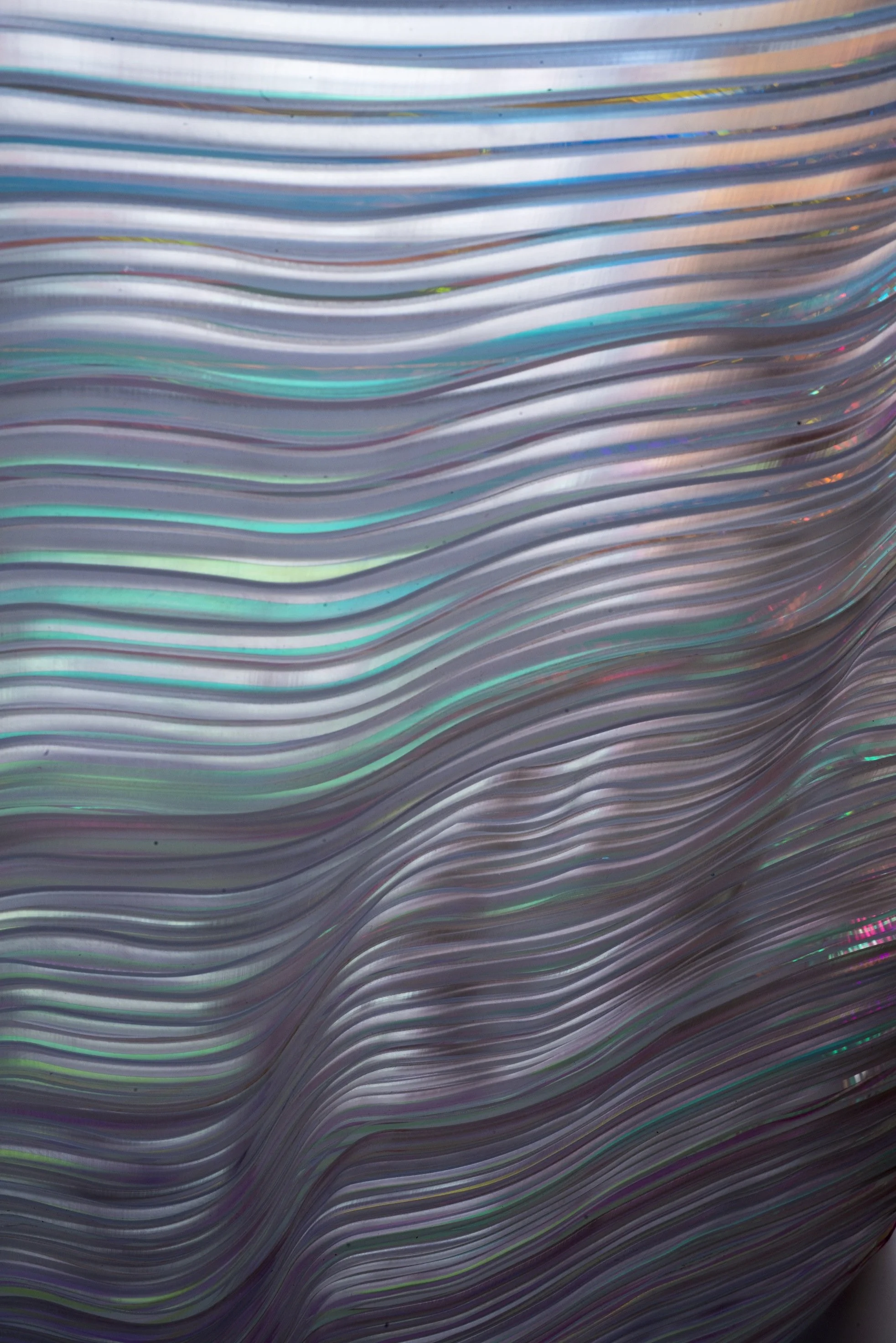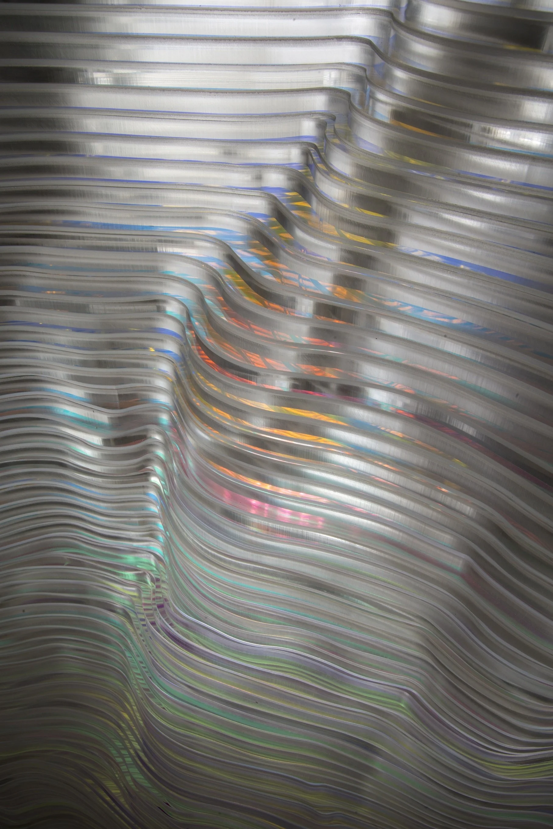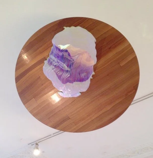 “I wanted the viewer to be able to look up and see the ozone hole hovering in the ceiling of the gallery. By creating a lens-like mirror and installing it above the work, I was able to use the mirror like a satellite, to reflect what was otherwise out of view to the earth bound... The work maps the ozone hole filtered through the lens of a computer, revealing its visual similarity to an iceberg. The narrative of the work highlights the history of ongoing issues surrounding global warming and today’s climate change realities.”