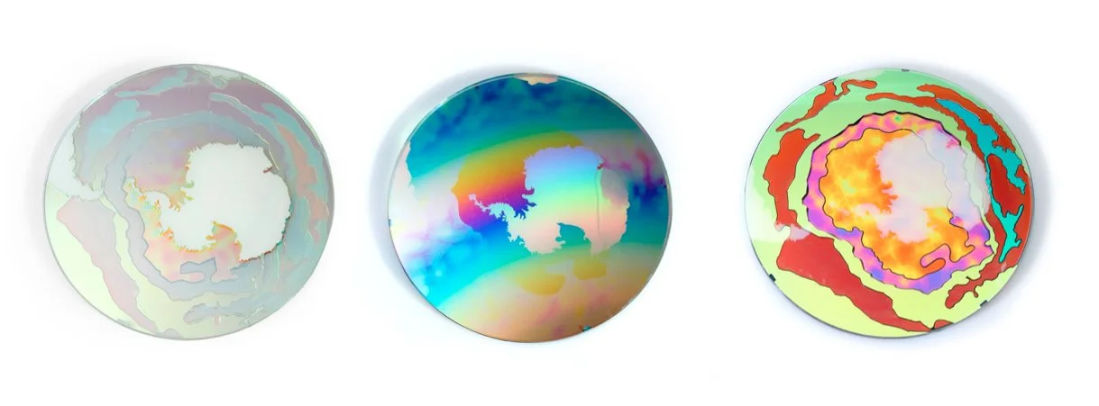 Life Support Systems uses NASA’s space suit helmet glass to create a series of three atmospheric weather maps charting shifting weather conditions in the atmosphere over Antarctica that have global implications. The maps are hung sequentially and read from left to right. The unfolding narrative of shifting weather is described in short texts below each work that evolve from history of monitoring Earth’s atmosphere to today’s attitudes towards Climate Change: the forecast for tomorrow. The aim of the series was to examine how the forecast for tomorrow’s weather is reliant on our perception of our environment today. The work is fabricated from glass that was originally used as a part of the life support system of a space suit and drawing a parallel with its natural counterpart, the Ozone Layer.