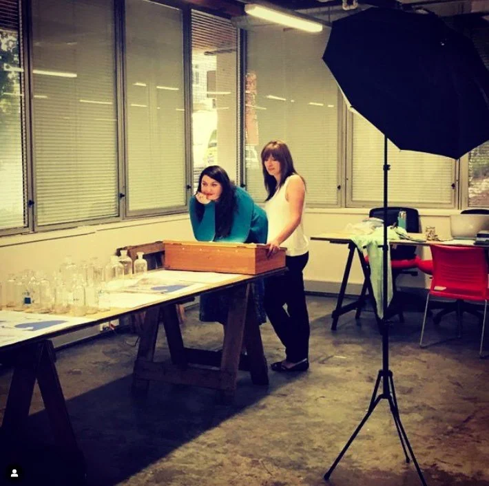 Media shoot day at The Catchments Project AIR - Works in progress (table), Jasmine (left), Debbie (right)